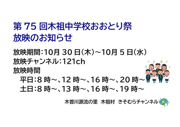 役場総務課から「木祖中学校おおとり祭」放映についてお知らせします。