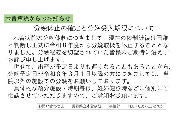 木曽病院より、分娩休止の確定と分娩受入期限についてお知らせします。