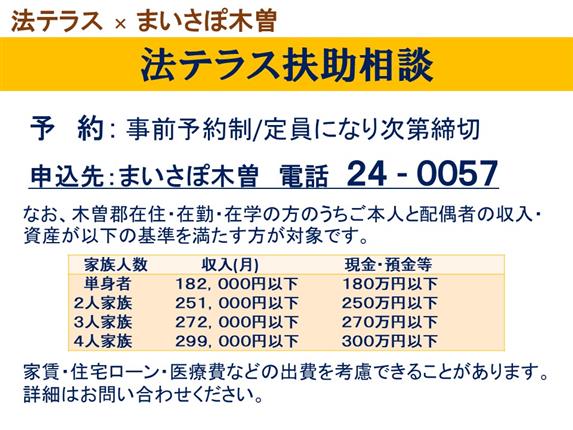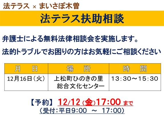 まいさぽ木曽より、無料法律相談会開催のお知らせです。