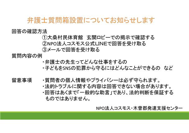 NPO法人コスモス・木曽郡発達支援センターから、「弁護士の先生に聞いてみよう!」のお知らせです。