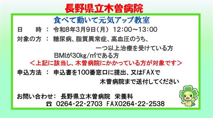 木曽病院より、令和8年3月9日(月)開催、食べて動いて元気アップ教室についてお知らせします。
