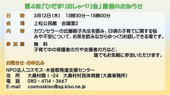 NPO法人コスモス・木曽郡発達支援センターから、第4回「ひだまりおしゃべり会開催」のお知らせです。