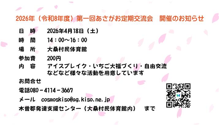 NPO法人コスモス・木曽郡発達支援センターより、「令和8年度第 1回あさがお定期交流会」開催のお知らせです。