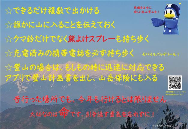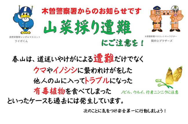 木曽警察署から、春山山岳遭難防止「山菜採り遭難にご注意を!」のお知らせです。