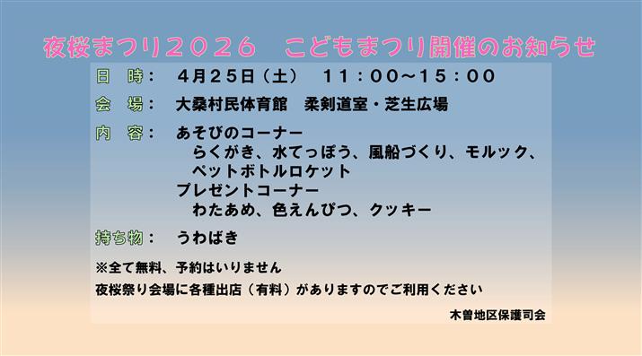 木曽地区保護司会から、「夜桜まつり2026 こどもまつり」開催のお知らせです。